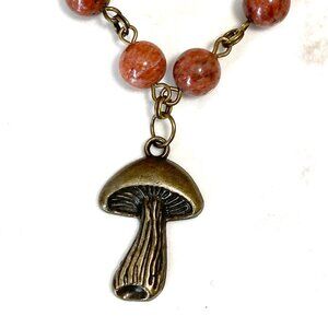 Genuine Red Jasper Short Necklace, Cute Bronze Slim Mushroom + Natural Gemstone