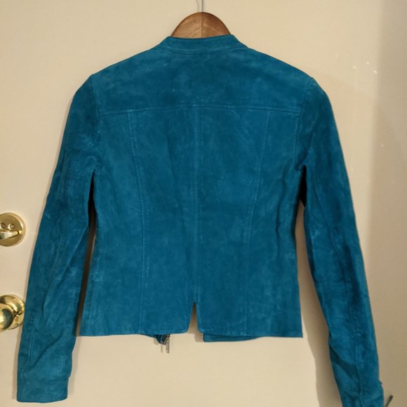 Genuine suede Mango jacket - worn only once. This is a buttery soft jacket in a lovely unusual petrol blue color with a lace-up detail on the sleeves. Fully lined. Side length 31.0 cm. Back length 51.0 cm. Fits very much like an XS.