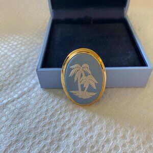 Genuine Wedgwood blue oval Hawaii brooch & matching clip earrings. Purchased in Honolulu, Hawaii. Both brooch & earrings are stamped on the back "Wedgwood made in England". New without tags, never been worn & in excellent condition. Brooch has a gold-tone oval edge & measures approx 1 1/2"L x 1 1/4"W with a 1" open C-type clasp. The pattern on front of brooch & earrings is palm trees. Matching round clip earrings have padded backs & each measures approx 3/4" in diameter. Includes Wedgwood box for each & comes from a non-smoking home. Truly a stunning set.