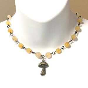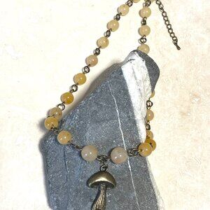 Genuine Yellow Aventurine Short Necklace,Bronze Slim Mushroom + Natural Gemstone