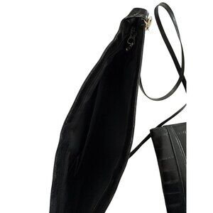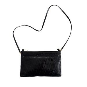 A black crossbody purse with a textured surface, made of eel skin. The pattern, creates a subtle visual interest. It may have a removable strap, allowing it to be used as a clutch. The purse have a top zipper closure, and an interior with pockets, and an open pocket on the opposite side. The overall impression is that of a classic and elegant accessory. Crossbody purses are typically designed to be worn across the body, allowing for hands-free convenience and security.