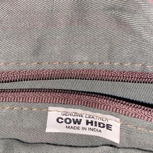 Genuine leather unbranded bag w/ silver tone zipper pull, knotted straps, tan thread ticking, outside pocket on front of the bag with snap closure. Inside pocket w/ nylon zipper closure. The inside of the bag is lined w/very soft polyester fabric. 🤎