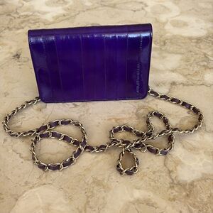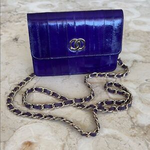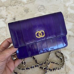 In excellent preowned condition pretty vintage eel skin mini bag with woven gold tone chain and leather strap. Classic styling in gorgeous buttery soft purple leather. Magnetic snap closure, leather lined interior with a zippered pocket.