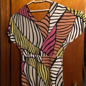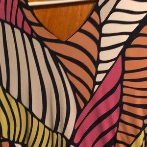 Colours are dark navy, pink, cognac, yellow, and white. Tunic/minidress, 2X Large, 96% polyester, 4% spandex. Pristine condition, never used. The original price was $75 plus tax.