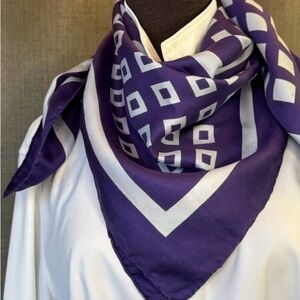 Elegant scarf with geometric pattern. Features purple and white squares. Stylish and versatile accessory.
