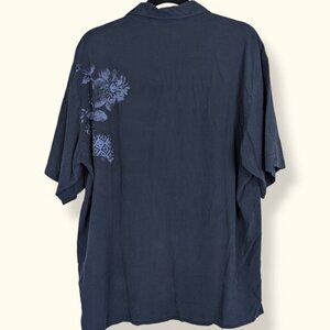 This shirt by Geoffrey Beene is made of 100% silk in dark blue with light blue floral pattern accents. The shirt has a button front closure and a comfortable lightweight fit. The shirt has some wear but nothing that affects wearability.