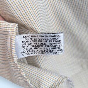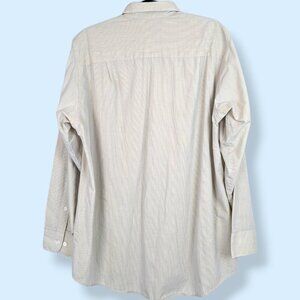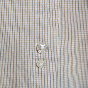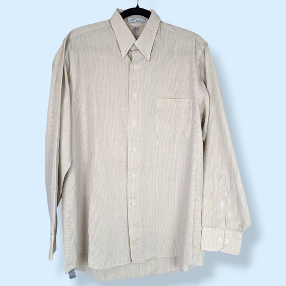 This buttoned dress shirt by Geoffrey Beene is made of a cotton/polyester blend (55/45) and appears beige but is more like a white background with very small, close crossing lines in beige and light blue. The shirt has a standard collar and button-down front, buttoned sleeve cuffs, and a single front pocket. There are also a couple extra buttons included, just in case. The shirt is in good condition and is without issues that would affect wearability.