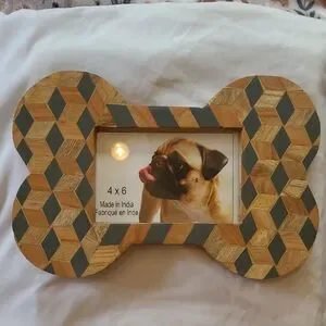 New. Great for dog lovers! Display your cherished memories with this stylish bone-shaped photo frame. Featuring a diamond geometric pattern in natural wood and black tones, it's a perfect accent for any home decor. Holds 4x6 sized photos. Comes from a smoke and pet free home.