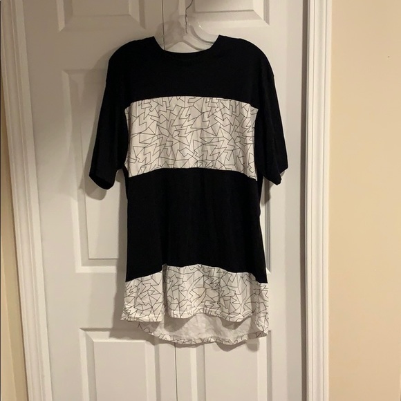 Worn only once or twice, it never fit me well. It’s a longer style of shirt and dips lower in the back then the front. Really fun geometric design