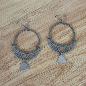 Geometric hoop earrings with triangle charm. Brand is Bloom Bijoux Bohème and is costume jewelry, so mixed metals. Very light!