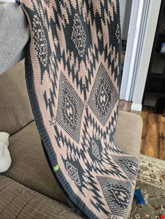 Soft knit scarf with bold geometric pattern. Cozy and stylish. Lightweight and versatile layering piece.