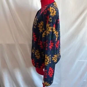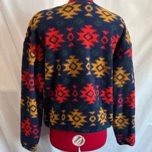This colorful women's cardigan features a vibrant geometric pattern. It is in good condition with no major flaws and minor wash wear.