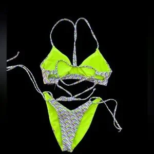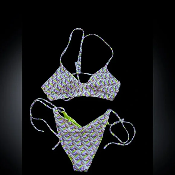 Dive into style with this vibrant geometric patterned bikini set. Featuring a mix of green and purple hues, this swimwear is perfect for making a splash. Enjoy comfort and fashion at the beach or pool.