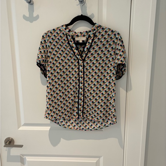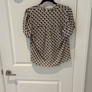 Stylish women's top featuring a vibrant geometric pattern. Perfect for adding a pop of color to your wardrobe.