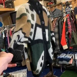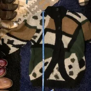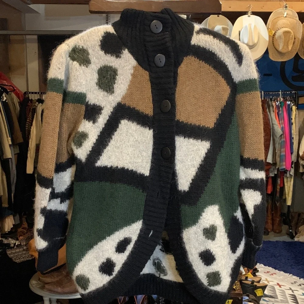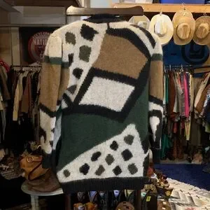 Stylish cardigan with a bold geometric pattern. Features black, brown, green, and cream colors. Perfect for a cozy and fashionable look.