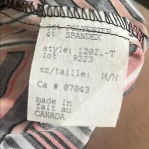 Stylish maxi dress with a geometric pattern. Features orange, black, and tan colors. Made in Canada