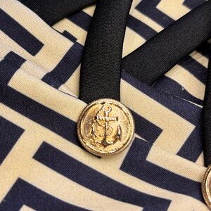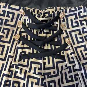 Stand out in these stylish pants featuring a bold geometric pattern and lace-up detail with gold button accents. Perfect for a chic and unique look.