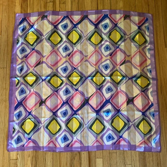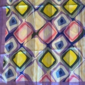 Vibrant silk scarf with geometric patterns. Features purple, yellow, blue, and pink colors.