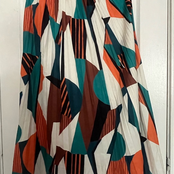 Elevate your style with this vibrant geometric patterned skirt. Featuring a blend of teal, orange, and brown, this skirt is perfect for any occasion. Its unique design adds a touch of modern flair to your wardrobe.