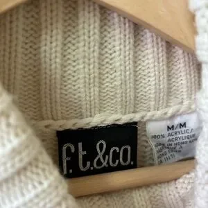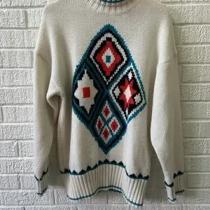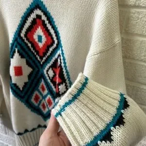 Unique retro cozy sweater with bold geometric patterns. Features cream, teal, red, and black colors.