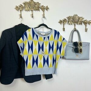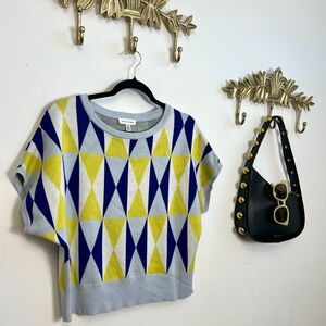Stylish sweater with a geometric pattern in blue, yellow, and gray. Perfect for a chic look.