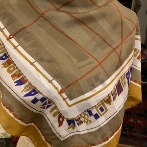 Stylish silk scarf with a geometric design. Features shades of brown, gold, and blue. 30 inches that make a square