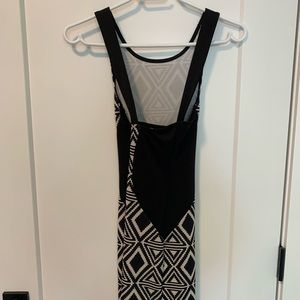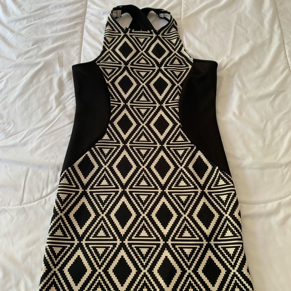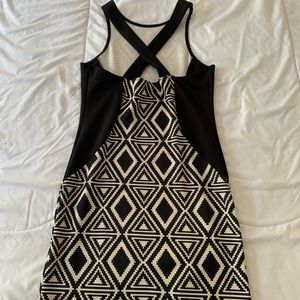 NWOT. Super stretchy black and cream bodycon mini dress. Straps cross in the back. There is no size tag but fits small to medium.