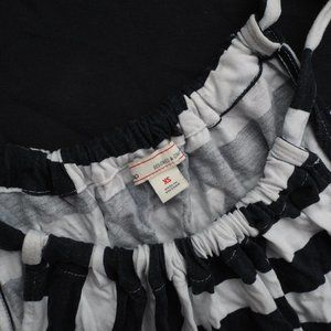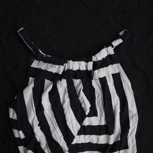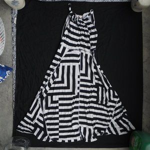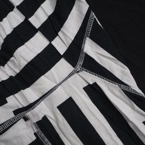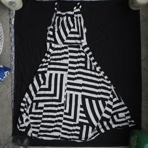 Ruched high neckline A-line 100% Cotton Drapes and moves very well I'm 5'3" and the hem hits below my knees