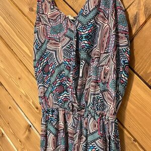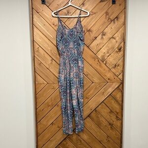 Chic geometric print jumpsuit. Featuring a blend of blue and pink, this piece is perfect for any occasion. Enjoy comfort and fashion in one stylish package.