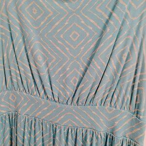 A pale blue and light grey sundress that hits around the knees with a belt like line around the waist.