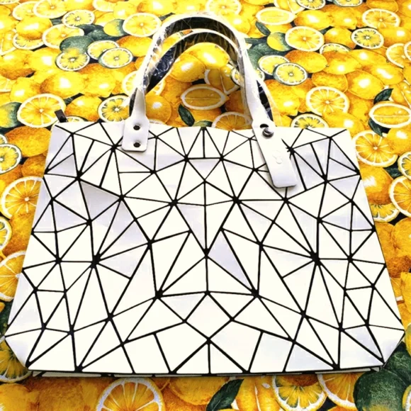 Trendy Geometric bag. Large size in egg shell or winter white on black color. Adjustable straps with one inside compartment. Measures 16" x 12.5" x 3". New.