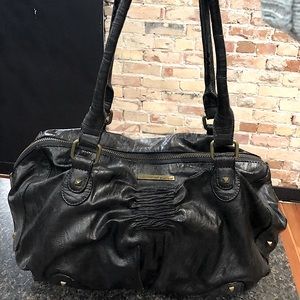 White with black geometric dot pattern. Silky & breathable fabric. Has relaxed fit with high-low hem. Can wear sleeves full length or cuffed & held at 3/4 length with button tab.
