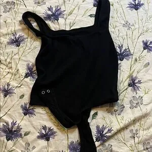 Sleek ribbed bodysuit with square neckline. Wide shoulder straps for coverage. Snap closure at the crotch. Smooth, versatile black finish.