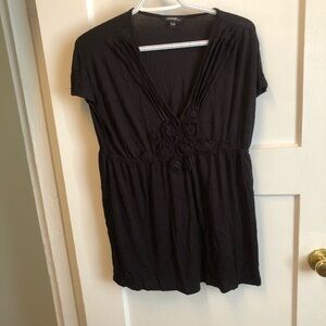 This elegant black blouse by George features a stylish ruched detail at the neckline, adding a touch of sophistication. The short sleeves and relaxed fit make it a comfortable choice for any occasion. Its longer length and empire waist design offer a flattering silhouette.