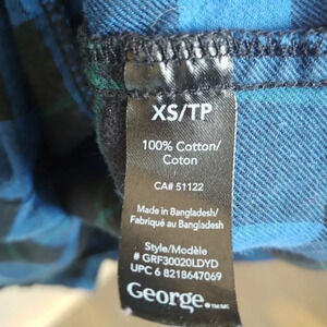 Great shirt for camping, sitting around a outdoor fire or gardening at dusk. Collar, button-down, buttons at cuffs, button elbows for rolling up the sleeve. Black and blue plaid print with small green accent lines. Soft, yet sturdy fabric.