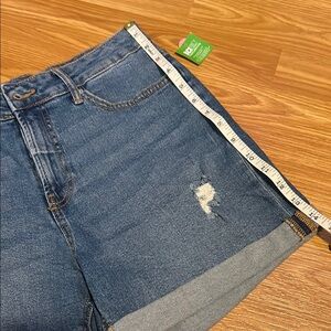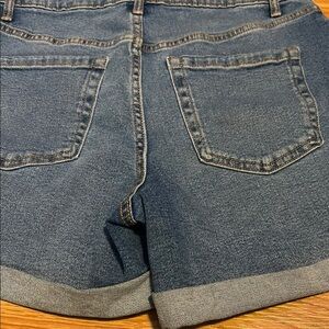 These George blue jean shorts feature a high-waisted design with a relaxed fit, perfect for casual outings. The medium blue denim color and cuffed hem add a classic touch, while the slight distressing gives them a trendy, worn-in look. Enjoy the comfort and style of these versatile shorts for any laid-back occasion.