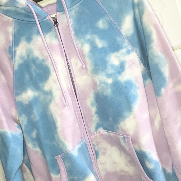 Stylish tie-dye track pants. Features a blend of blue and pink. Comfortable and trendy design.