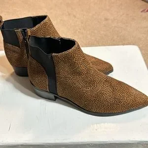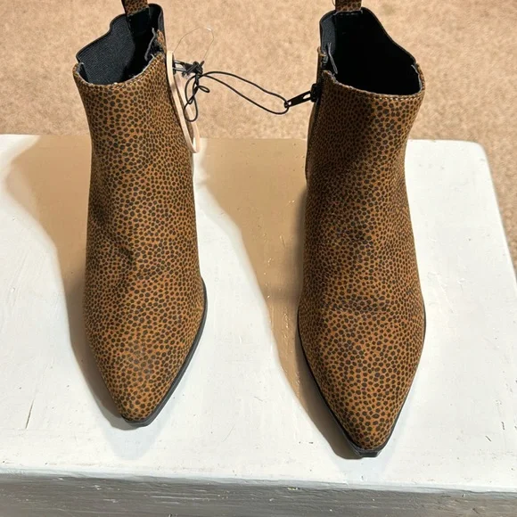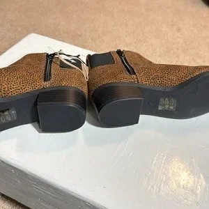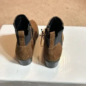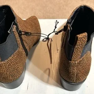 Animal print, short boots with elastic around ankle and zippers on the inside.