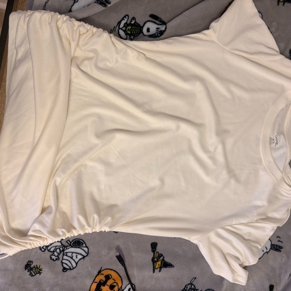 Soft ribbed knit top. Crew neckline. Subtle gathered hem. Lightweight and easy to layer.