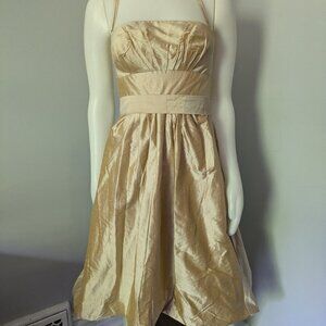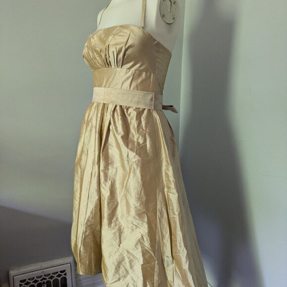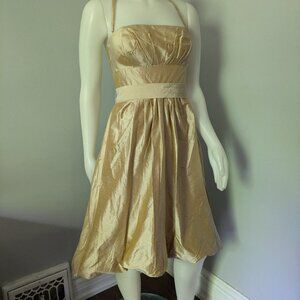- halter dress with tie, sash at waist, balloon bottom higher at the front and lower at the back