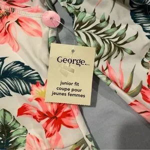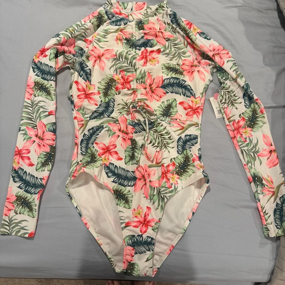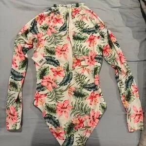 Adorable floral rashguard with pink flowers and green leaves. Ideal for beach or pool fun. Super convenient pull string attached to the back zipper and a cute keyhole in the front.