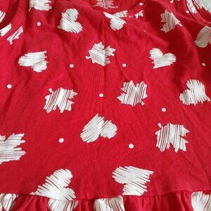 Color is Red with all over maple leaf, hearts and polka dots pattern. The leaves and hearts are in a scribble type design.