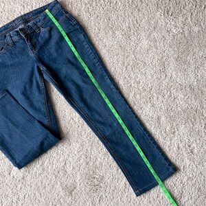 Straight leg blue denim jeans with lots of life left to give! Length on tag is not accurate as these have been hemmed for a shorter leg. Please refer to measurements in the photos.