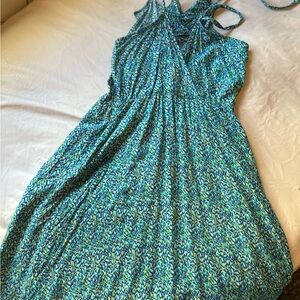 Gorgeous George aqua,blue and yellow Multi Colour Ruffle Mini summer Dress with strap and pockets on the side, size small, 100% Rayon.Excellent Condition