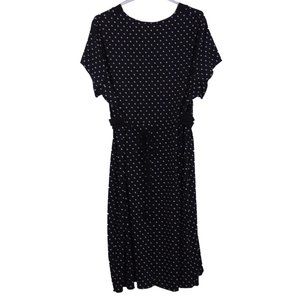 Add some elegance to your wardrobe with this black and white polka dress by George Plus. Dress features short sleeves and a decorative black front design and a back tie.