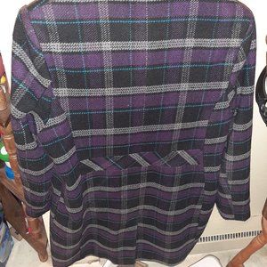 Beautiful purple plaid design, very comfortable body fit. Stitching and buttons still tight. Pre-loved worn only to church.