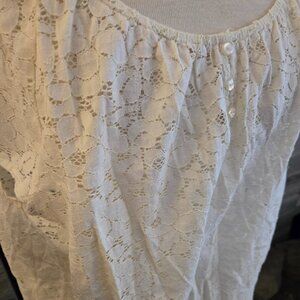 Lovely George Plus sheer lace blouse in Excellent Used Condition (EUC). This white/off-white top features an all-over floral lace pattern, a classic gathered scoop neckline, and delicate cap sleeves. The neckline has a small partial button placket with three subtle pearl-style buttons. Perfect for a feminine, romantic, or Boho-chic look. Layer it over a camisole or tank top.