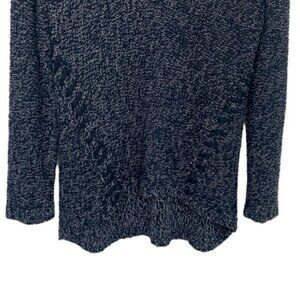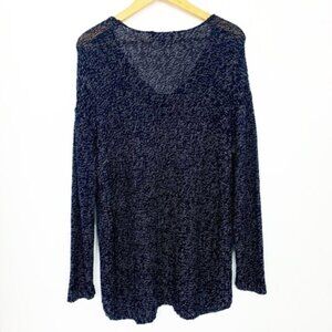 Soft and cozy navy and white marled knit sweater with flattering V-neckline and asymmetrical chevron accents created by tonal shoelace-style threading woven through the knit for a textural twist. Relaxed fit and midweight feel make it perfect for layering in cooler weather. Long sleeves, slight high-low hem, and a comfortable stretch.