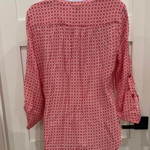 Chic red blouse with geometric pattern. Features a buttoned neckline. Ideal for casual or formal wear.