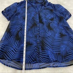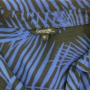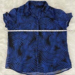 George Short Sleeve Button Down Blouse, Black and Blue Palm Leaf Print, Size XL